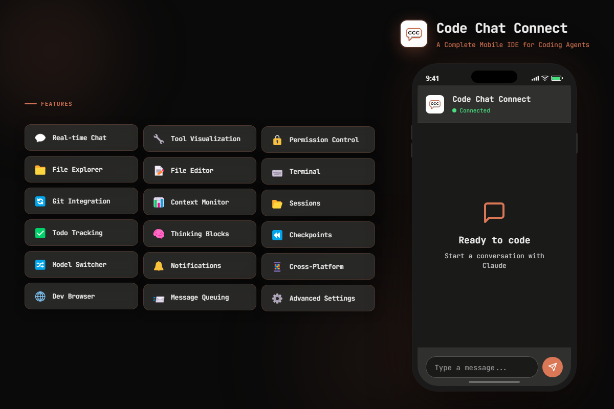 Chat with agents, approve permissions, browse files, manage git — all from your phone.